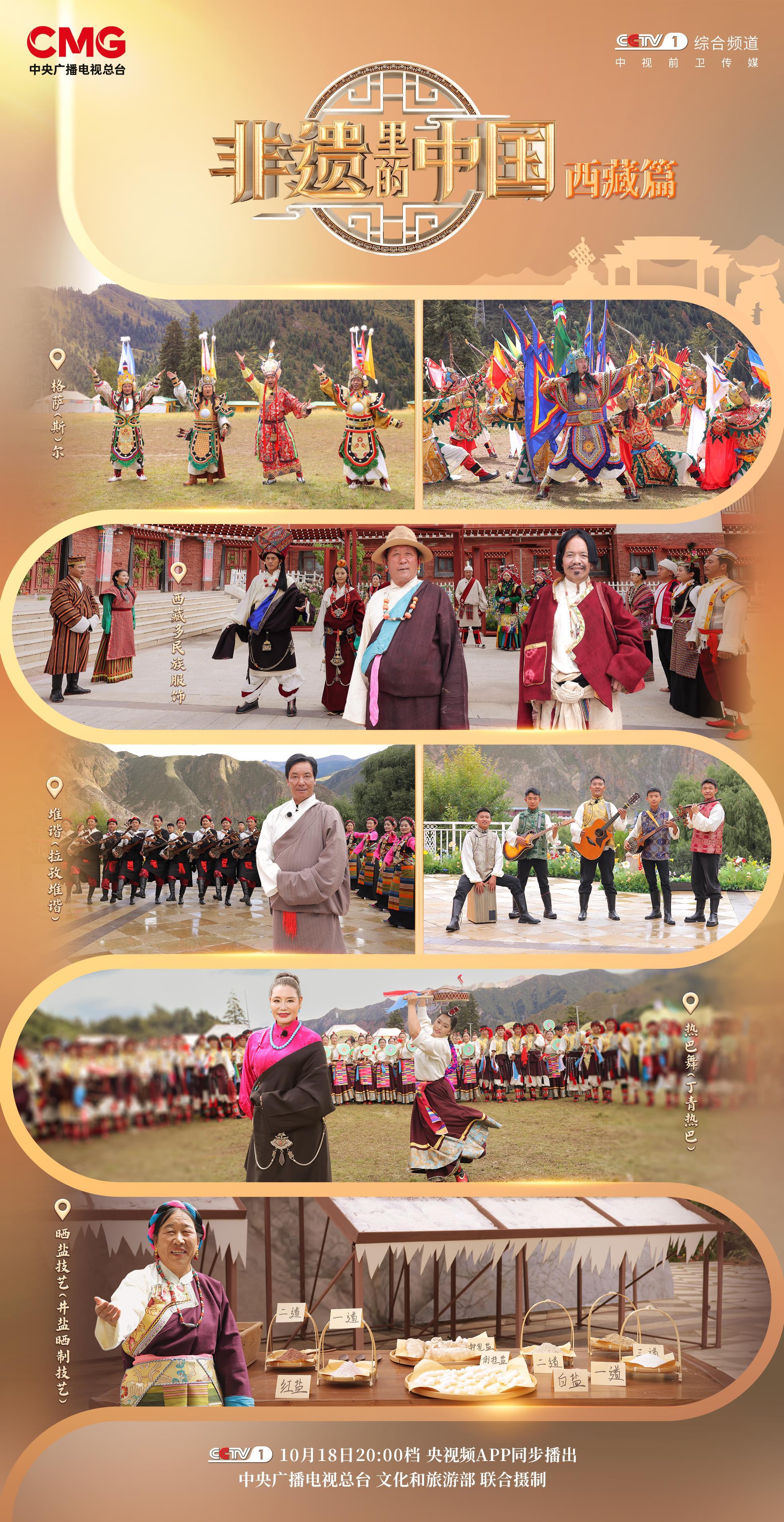 由中央广播电视总台与文化和旅游部联合制作的大型文化节目《中国非物质文化遗产》西藏版将于10月18日晚8点在中央电视台综合频道(CCTV-1)播出,并在央视全网独播。