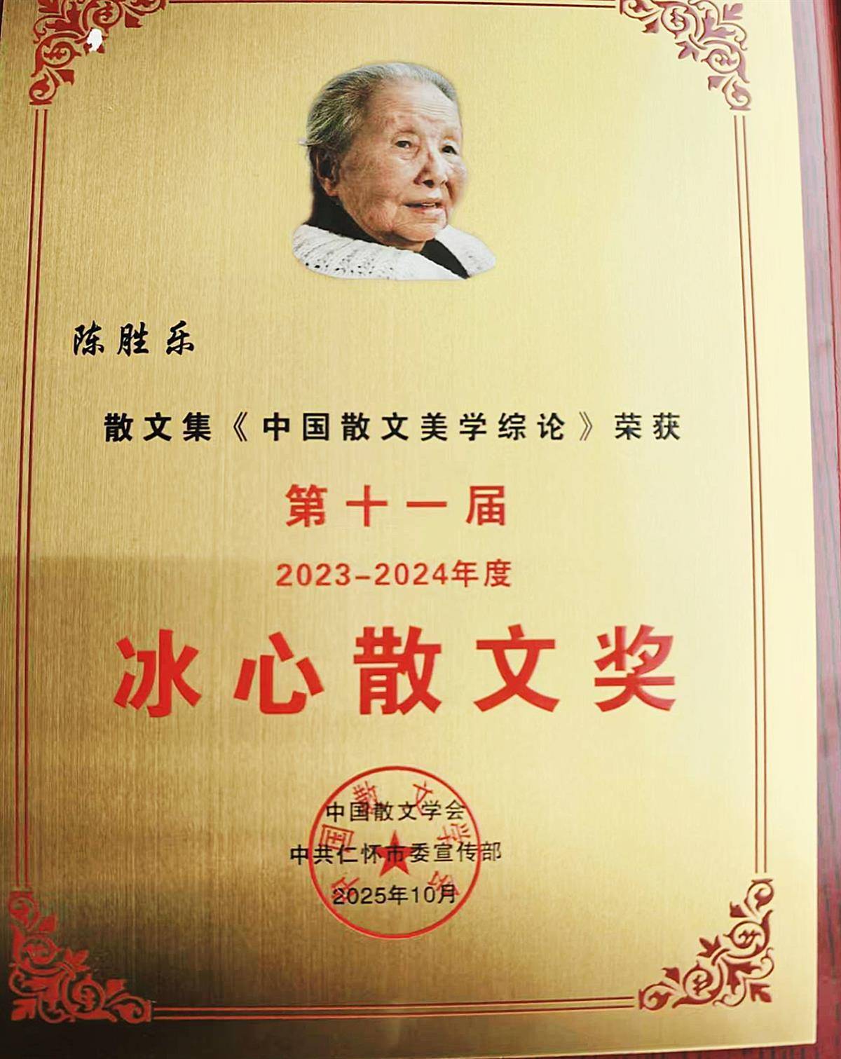 第十一届冰心散文奖于10月30日在贵州省仁怀市揭晓,51件作品获奖。谢冕的《为今天干杯》、萧徽月的《苏醒的河流》等20部作品荣获散文集奖。任福侃的《干净又干净》、乌娜的《悲伤是一条黑暗的河》等三十篇作品获得了单作者散文奖。宜昌作家陈胜乐凭借《中国散文美学综合评述》获得散文理论类唯一获奖者。冰心散文奖奖章 陈胜乐,1963年出生,宜昌长阳人。毕业于武汉大学中文系。兼任中国作家协会会员、宜昌市散文协会副会长、宜昌市小说协会副会长。日前,他当选为宜昌军区作家协会主席。陈胜乐主编《三峡文学》杂志,专攻从事散文美学理论研究数十年。这片充满诗情画意的土地,淳朴的民风和美丽的山水,激发了陈胜乐对文学的热爱,成为创作灵感的源泉。陈胜乐在漫长的创作生涯中,出版了《散文美学概论》、《现代散文思想新思潮》等十多部理论著作、小说和散文集。作品多次荣获重大奖项,部分文章在《新华文摘》、《散文选刊》等刊物转载。获奖作品《中国散文美学探索》是一本系统探讨中国散文美学的学术著作,预计于2024年由作家出版社出版。本书约32万字,共54章,分为绪论、历史理论、正文、政治理论、应用理论、支腿八个部分。社会理论、学校理论和政治理论。 “对于作家来说,文字是写作的器官和寄托,灵魂在文字中沉浮,是一种莫大的快乐。”陈胜乐在获奖感言中表示,《中国散文美学研究》致力于搭建读者与作家沟通的桥梁,追溯散文几千年的根源,为创作者打开灵感的“水龙头”,让浩瀚的历史变得更加透明,让深刻的美学变得更加通俗易懂。第十一届冰心散文奖获奖名单 第十一届冰心散文奖获奖名单 冰心散文奖是中国散文协会根据冰心先生的遗嘱于2000年设立的。创刊以来,铁凝、贾平、蒋子龙、蔡子健、萧复兴、赵丽红、葛平、周小枫等作家均获此殊荣,在文坛产生了广泛影响。 (湖北日报全媒体记者 文凯 通讯员熊向华)